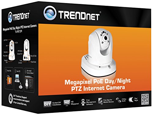 The Megapixel PoE Day / Night PTZ Internet Camera;model TV-IP672PI;provides day and night security over a large area. Pan the camera side-to-side a remarkable 340 degree and tilt up-and-down 115 degree from any Internet connection. Record indoor video in complete darkness for distances of up to 7.5 meters. No need to install this camera near a power source;power and data are received through a single Ethernet cable using Power over Ethernet (PoE) technology (See TRENDnet PoE Switches and Injectors). Record 1280 x 800 Megapixel (WXGA) video at up to 30 frames per second (fps). Manage up to four video profiles to record HD video while streaming low resolution video to a compatible smart phone at the same time. Manage up to 32 TRENDnet cameras with the included complimentary camera management software. Advanced features include adjustable motion detection recording areas;email alerts;scheduled recording sessions;pan / tilt;Auto-Patrol;H.264 / MPEG-4 / MJPEG image compression;date-and-time overlays;a Micro-SD card slot for backup storage;two-way audio (speakers not included);an adjustable lens;and four times digital zoom. A wall / ceiling mounting kit is included and the camera’s off white housing blends into most environments.